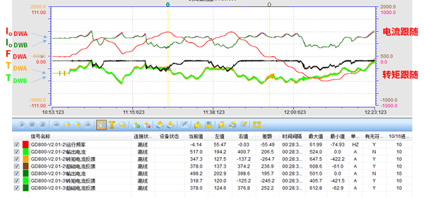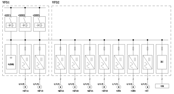 3) 整个驱动系统使用GD800工程型变频系列产品,采用二极管整流,共直流母线方案。