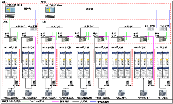 1)单元与控制盒之间采用光纤通讯,两台逆变柜之间主从也采用光纤通讯,传输速率高,每组泥浆泵、绞车A/B之间均采用主从方式控制。