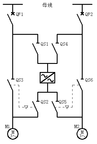 1)首先变频运行,QS1,QS2, KM1, KM2闭合,KM4闭合,电抗器被短路;