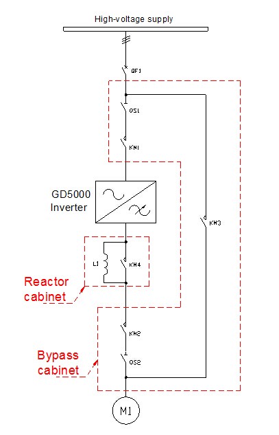 本项目Goodrive5000系列变频器配置的旁路系统采用一拖二手动方案,变频与工频能够手动切换。变频调速系统由用户开关、手动旁路柜、高压变频器、高压电机组成。手动旁路柜是由真空高压隔离开关组成。手动旁路柜严格按照“五防”联锁要求设计,完全能够保证变频调速系统安全运行。