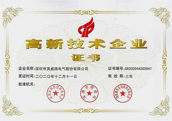 近日,全国高新技术企业认定管理工作领导小组办公室发布了《深圳市2020年认定高新技术企业名单》,深圳市英威腾电气股份有限公司榜上有名,荣膺"国家高新技术企业"。英威腾于2008年首次被认定为国家高新技术企业,有效期三年。2011年、2014年、2017年英威腾顺利通过复审。2020年英威腾根据相关规定,积极开展高新技术企业复审工作,再次顺利通过复审。获此殊荣,表明英威腾在产品研发能力、科技创新实力、研发费用投入及成果转化能力等核心指标得到了权威认可。