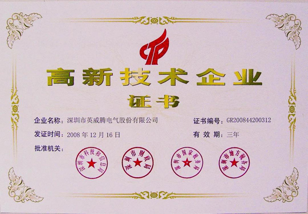 2008年 搬迁至英威腾高发科技产业园;获得“国家级高新技术企业认证”