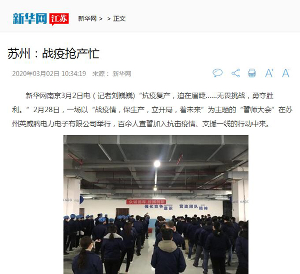 “抗疫复产,迫在眉睫;英威腾人,成为我们。众志成城,勇往直前;英威铁军,所向披靡。高中基层,齐心协力;无畏挑战,勇夺胜利。”2月28日中午,一场以“战疫情,保生产,立开局,着未来”为主题的特殊“誓师大会”在苏州英威腾举行,来自公司管理团队、办公室职员团队、研发团队及营销中心团队百余人宣誓加入支援一线的行动中。