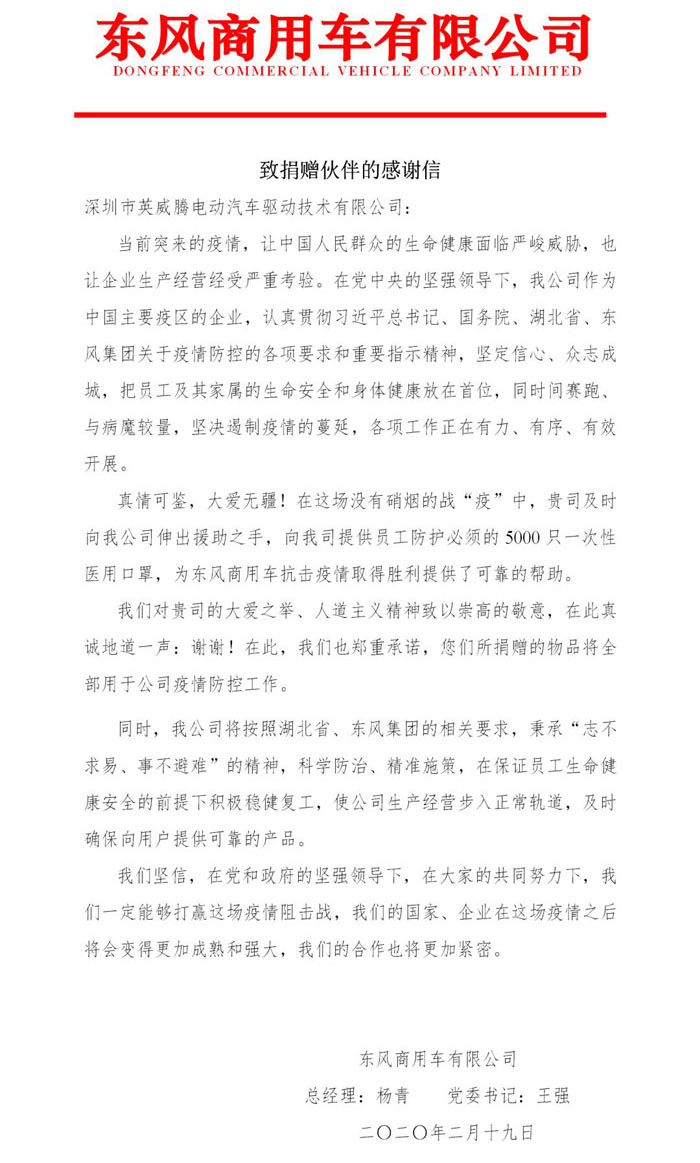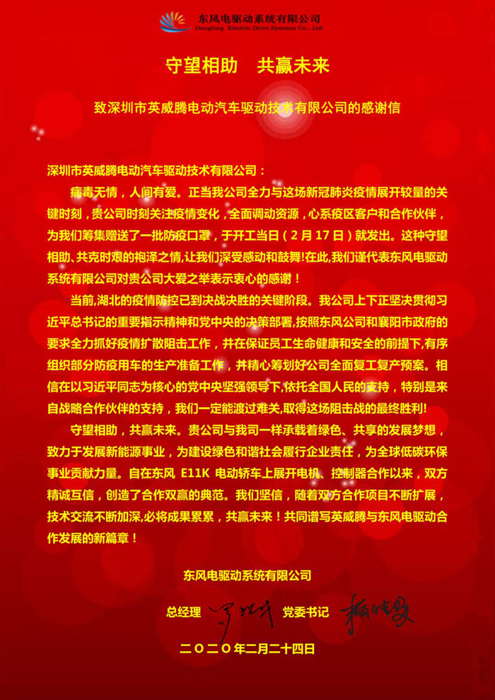 东风电驱动公司作为英威腾重要的合作伙伴,在此次抗击疫情的作战中,对英威腾在灾情面前,心系伙伴的举动所感动。