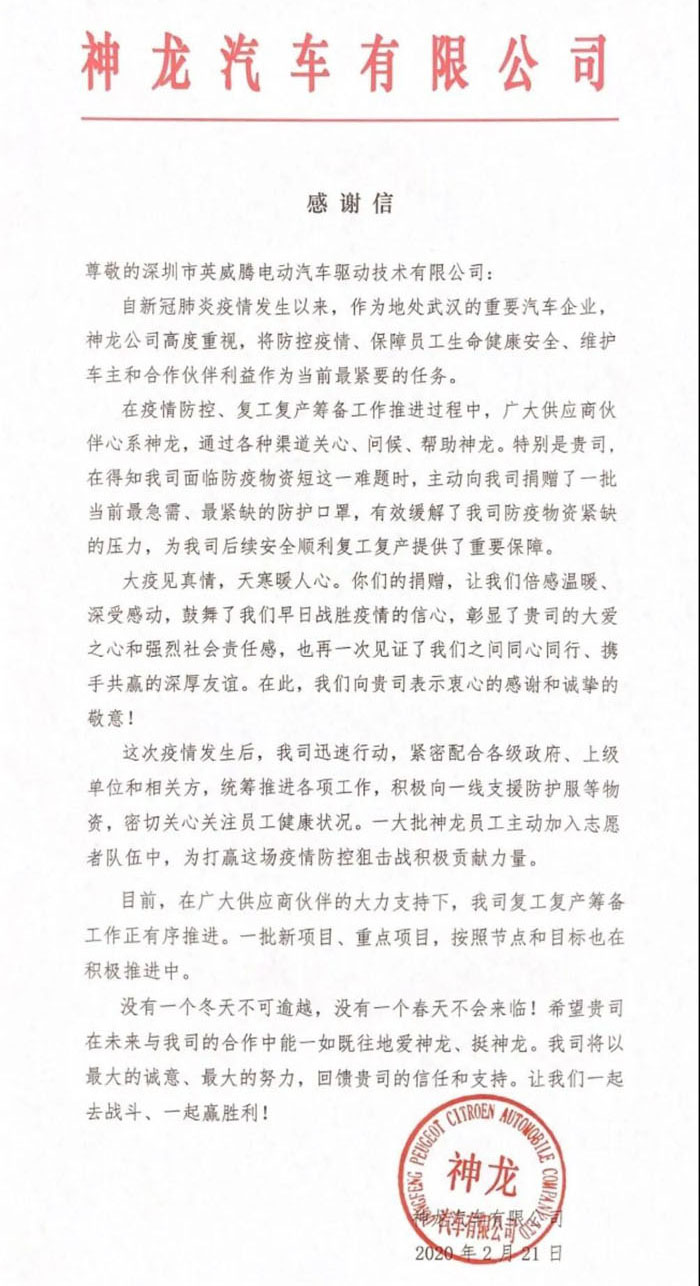 神龙汽车作为地处武汉重疫区的重要车企,对英威腾“同心同行,共抗疫情”的帮助表示感谢。